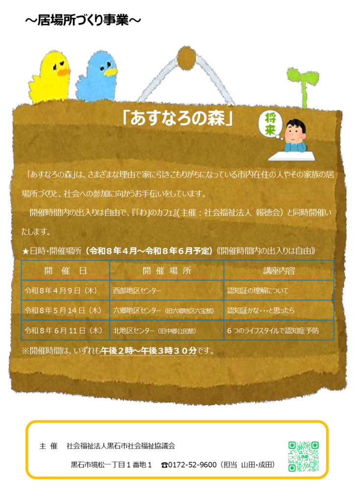 ~居場所づくり事業~「あすなろの森」 広報くろいし掲載記事の訂正について ※「広報くろいし №1380 2025年11月号」 23ページに掲載されました「あすなろの森」の記事について、開催場所に間違いがございました。お詫び申し上げますとともに、... -