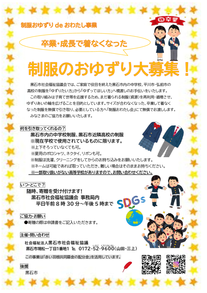 【制服おゆずりdeおわたし事業】制服おゆずりdeおわたし事業は卒業で役目を終えた、またはお子さんの成長により着られなくなった黒石市内の中学校と黒石市近郊の高校の制服を無償で「おゆずり」いただき、必要な方へ無償で「おわたし」する取り組みです。... -