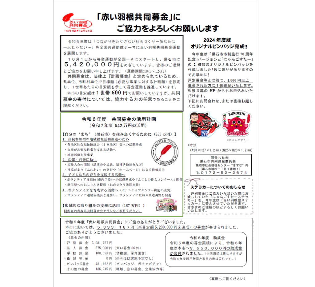 10月1日から全国一斉に始まった“赤い羽根共同募金運動”ですが、黒石市内の各店舗にて募金箱の設置にご協力を頂いています。また、にゃんごすたーオリジナルピンバッジ募金にもご協力頂いています。募金箱設置にご協力いただいた店舗は画像のとおりです。ご...