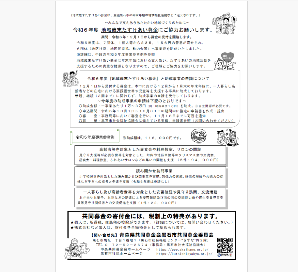 「『地域歳末たすけあい募金』助成事業の申請を受け付けています」本会では、「地域歳末たすけあい募金」に寄せられた寄付金を、12月から1月末の年末年始に行われる一人暮らし高齢者などの在宅における要援護世帯や児童等を支援する事業に助成しています。... -