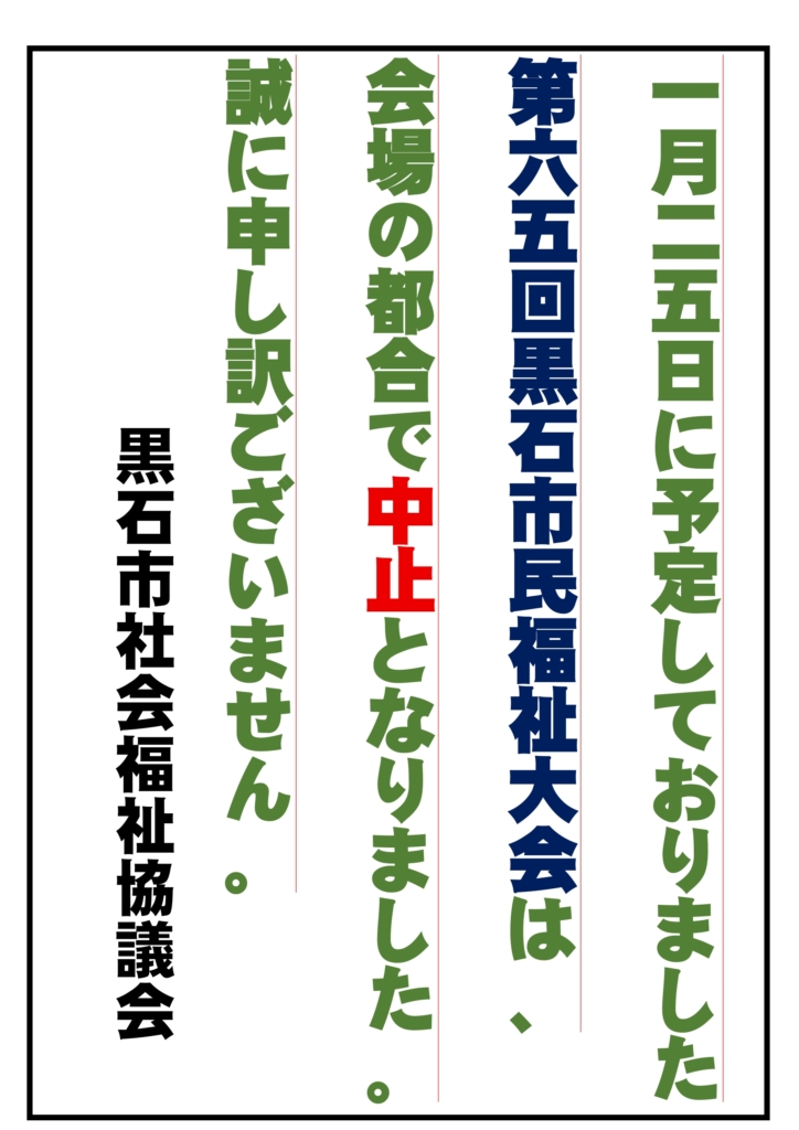 令和8年1月25日に開催を予定しておりました「第65回 黒石市民福祉大会」は、開催会場である津軽伝承工芸館周辺で電線切断事故が発生し、会場の使用ができなくなったため、中止とさせていただきます。